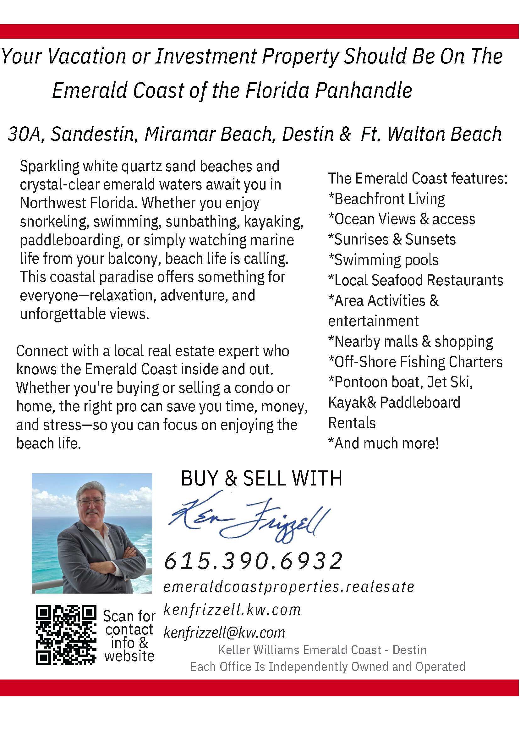 - Regional Focus: Ken serves the Emerald Coast of the Florida Panhandle, including communities like Panama City Beach, 30A, Miramar Beach, Santa Rosa, Destin, Fort Walton and Okaloosa Island beaches.emeraldcoastproperties.realestate